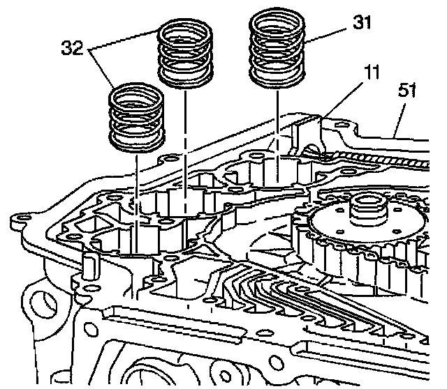 ACCUMULATOR SPRINGS INSTALLImportant: The 1-2 accumulator spring (31) is slightly taller than the other two springs (32). Install a 1-2 accumulator spring in the bore closest to the electrical pass through connector (11).