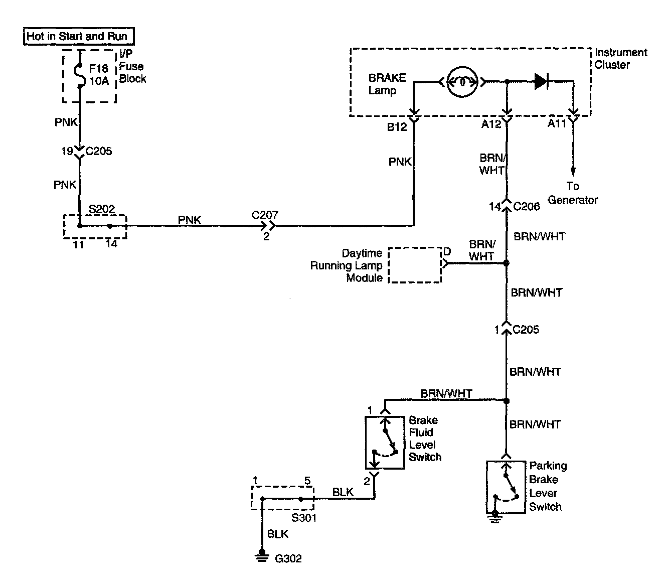 The BRAKE lamp glows brightly when the ignition is ON and either the parking brake lever switch or the brake fluid level switch is closed. If neither switch is closed, the BRAKE lamp receives a ground through the generator, and it glows dimly when the ignition is ON and the engine is off. When the engine starts, the generator creates voltage. With voltage on both sides of the lamp, the lamp turns off.