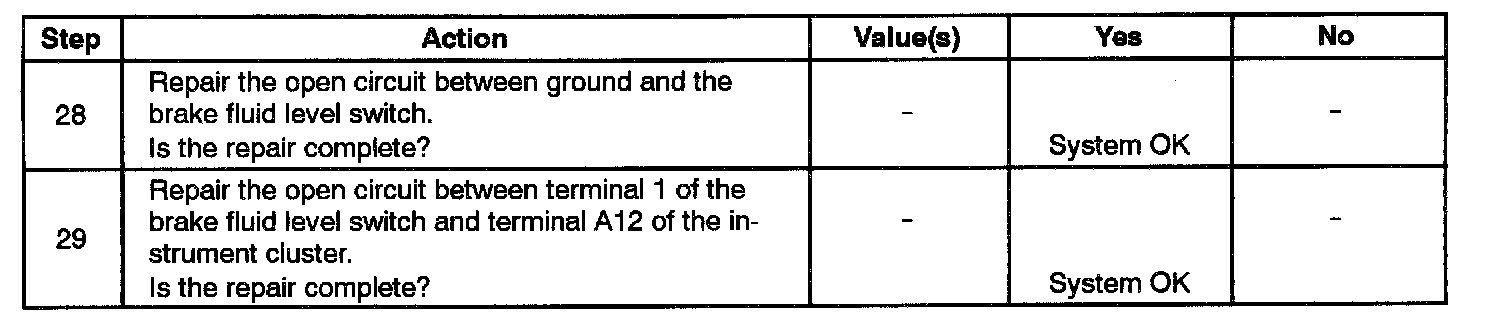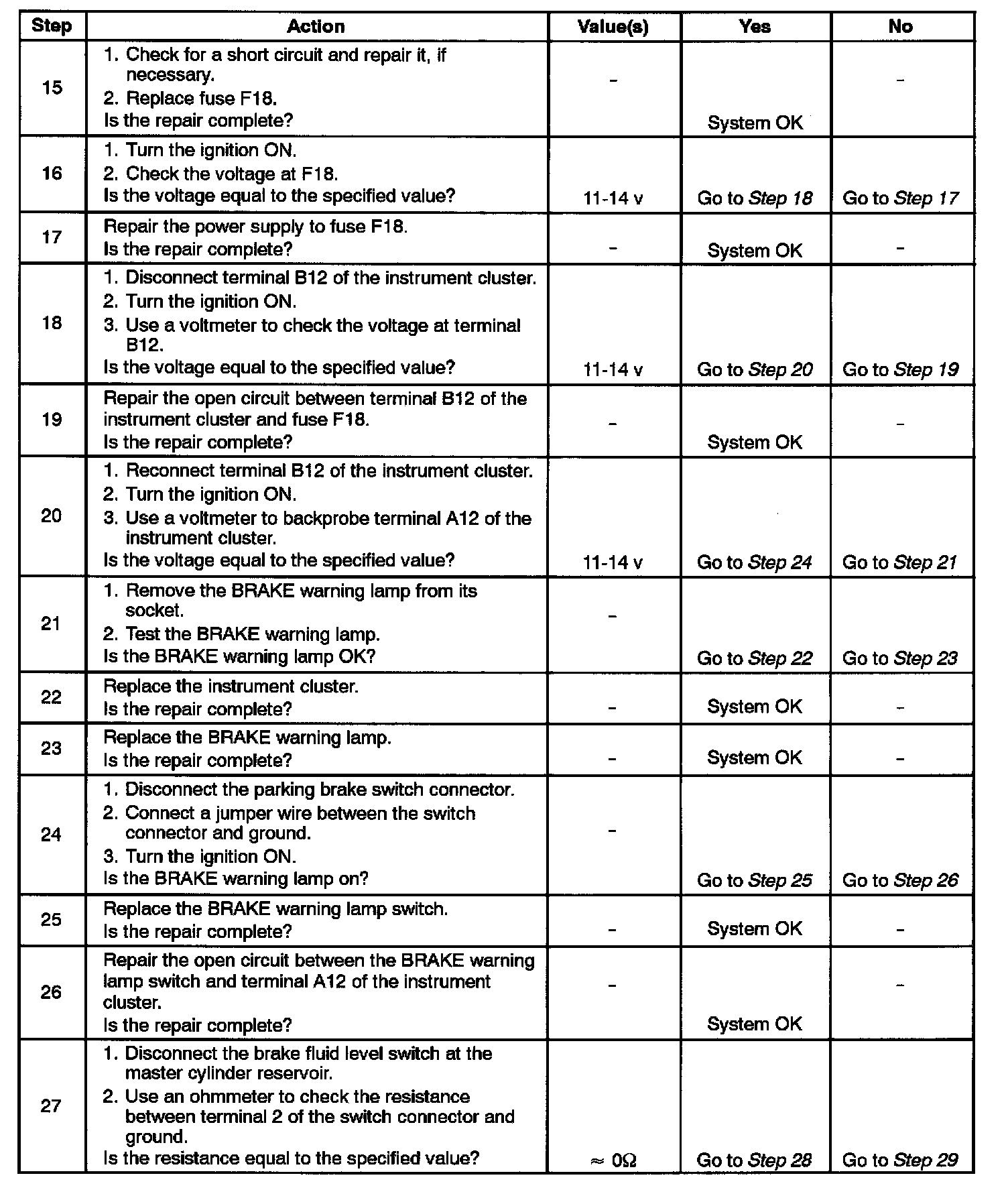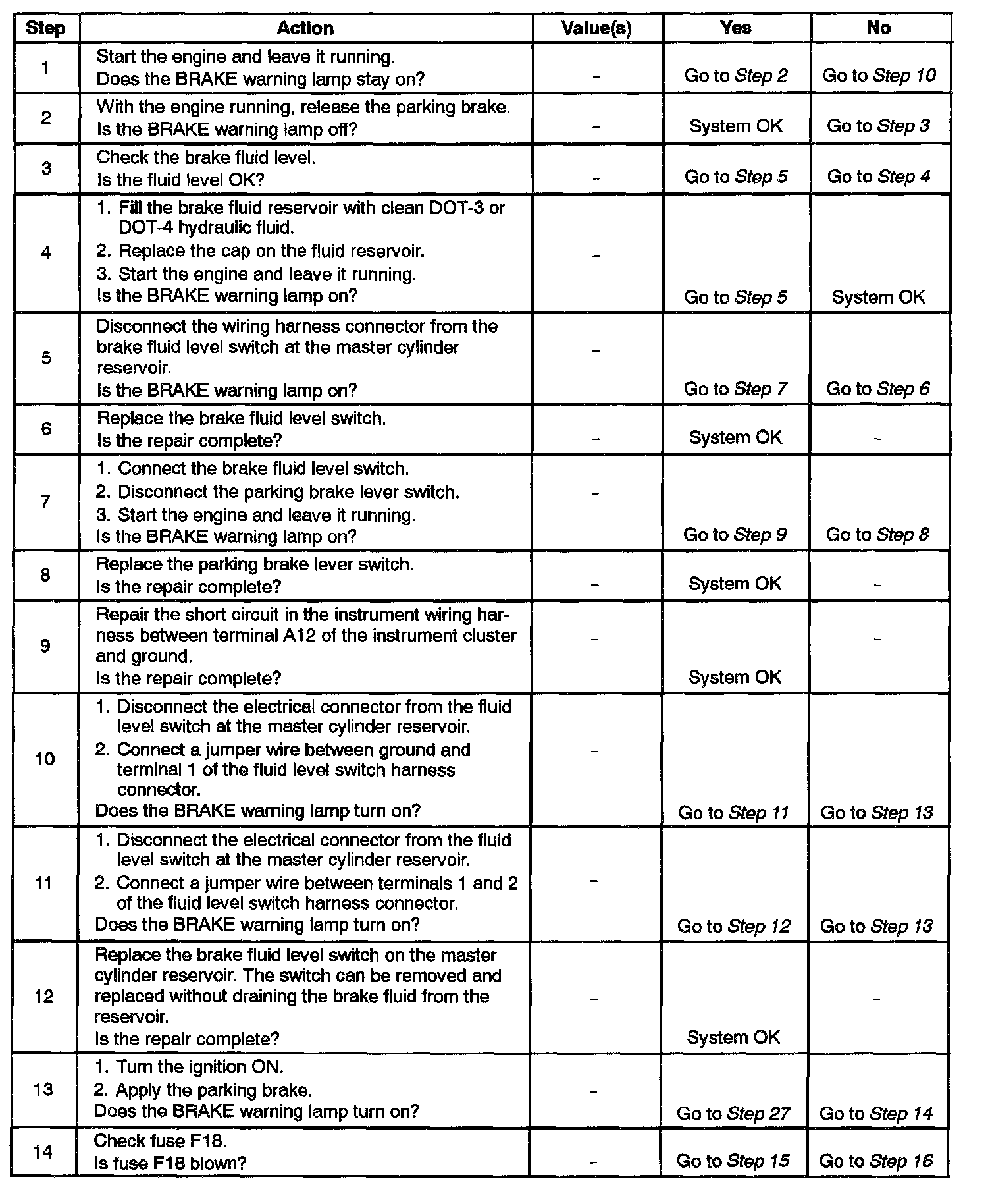 2. This step begins the test sequence for a BRAKE warning lamp that never turns on.