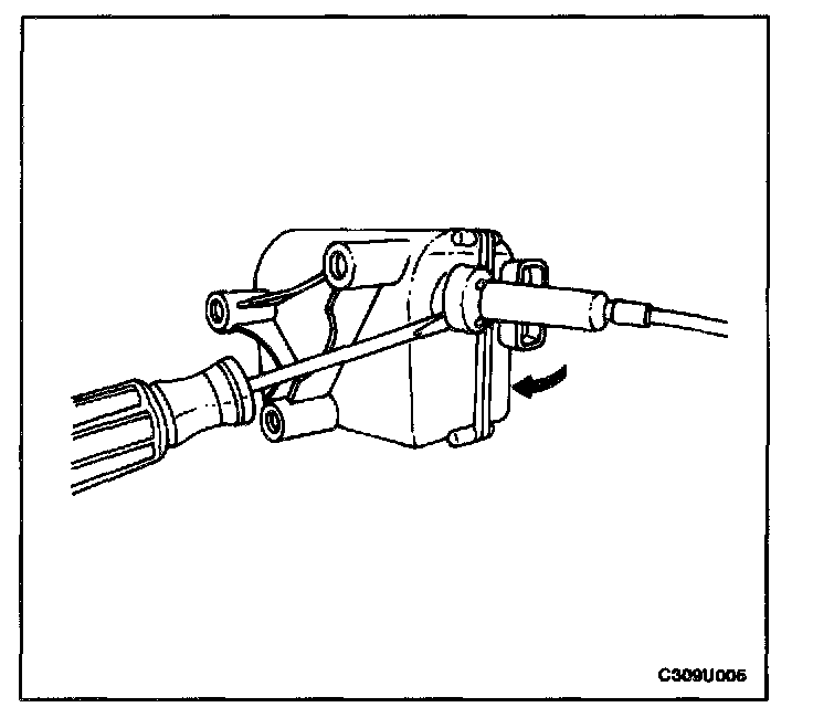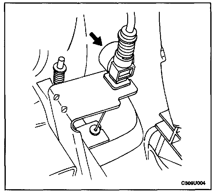 4. Press the cable adjuster button and adjust the cable so that the cable ball nipple is 0.5 mm (0.02 inch) from the bushing on the accelerator assembly.