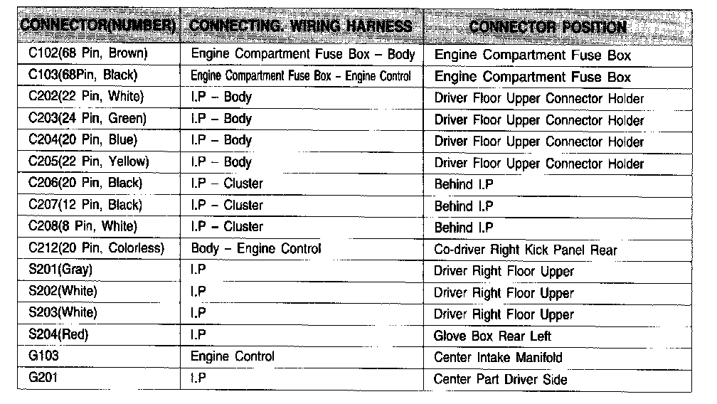 Connector Information Chart: