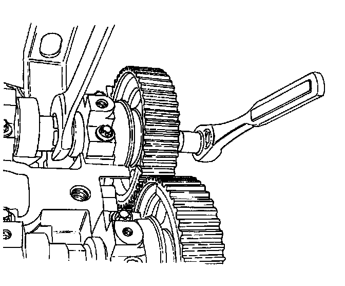 10. While holding the intake camshaft firmly in place, remove the intake camshaft gear bolt.