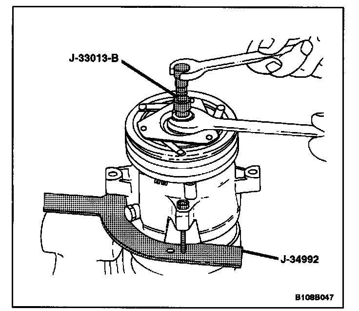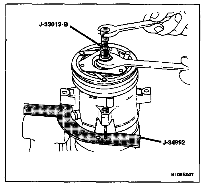NOTE: If the center bolt is threaded fully onto the end of the compressor shaft, or if the body of the hub and drive plate remover/installer J-33013-B is held and the center bolt is rotated, the key will wedge and could break the clutch drive plate and the hub assembly.