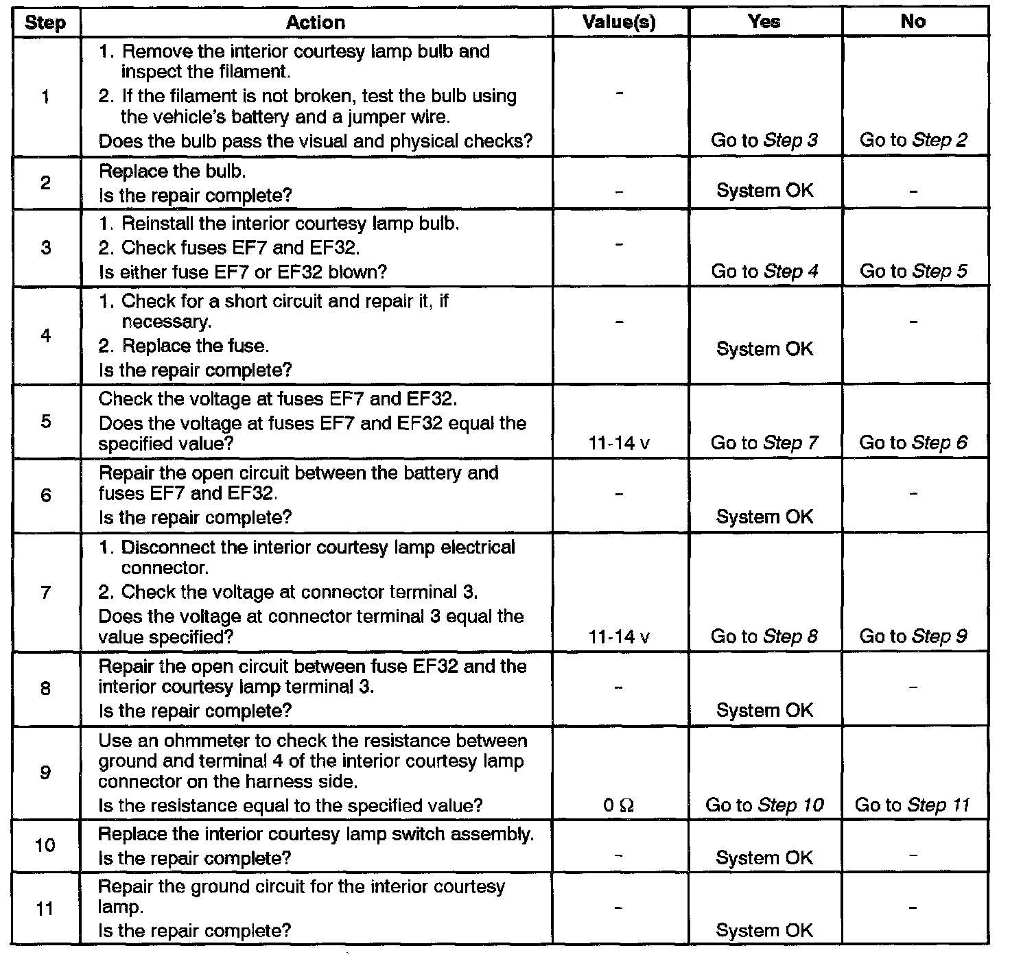 Interior Courtesy Lamp InoperativeCAUTION: Always make sure there is an electrical load, such as a lamp bulb, in any circuit between battery terminals. Do not make a short circuit between battery terminals with a jumper wire, or hazardous sparking will result.
