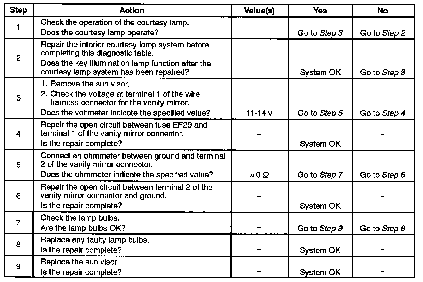if the vanity mirror lighting is working on one side of a mirror but not on the other side, check the lamp bulb. If the vanity mirror lighting is working on one side of the car but not on the other side, begin the diagnostic table at Step 3.