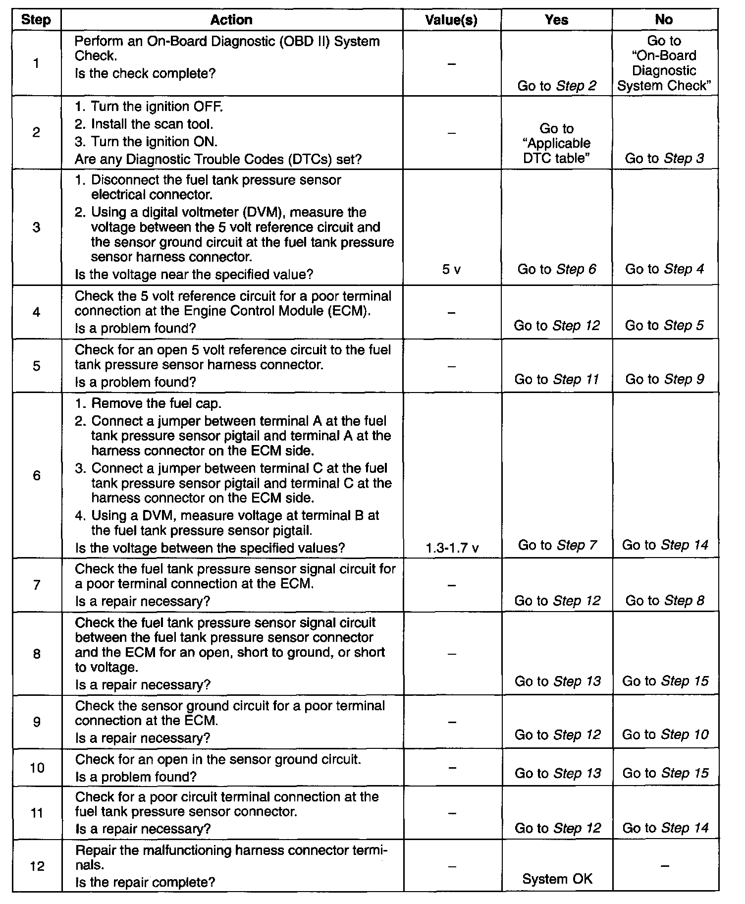 - Damaged harness. Inspect the wiring harness for damage. If the harness appears to be OK, observe the Fuel Tank Vacuum Pressure display on the scan tool while moving connectors and wiring harnesses related to the sensor. A change in the display will indicate the location of the fault.