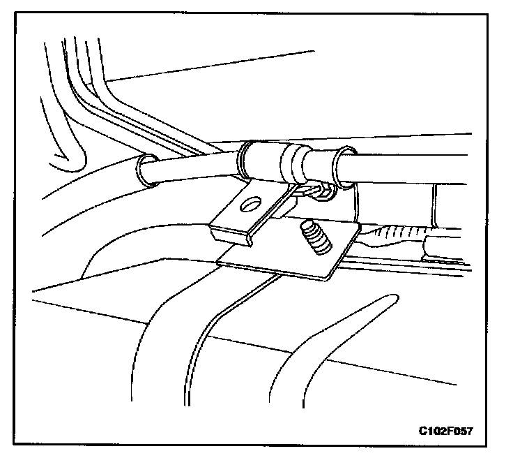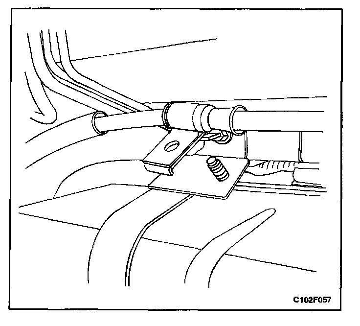 11. Connect the right rear parking brake cable to the retaining bracket attached to the right side fuel tank strap.