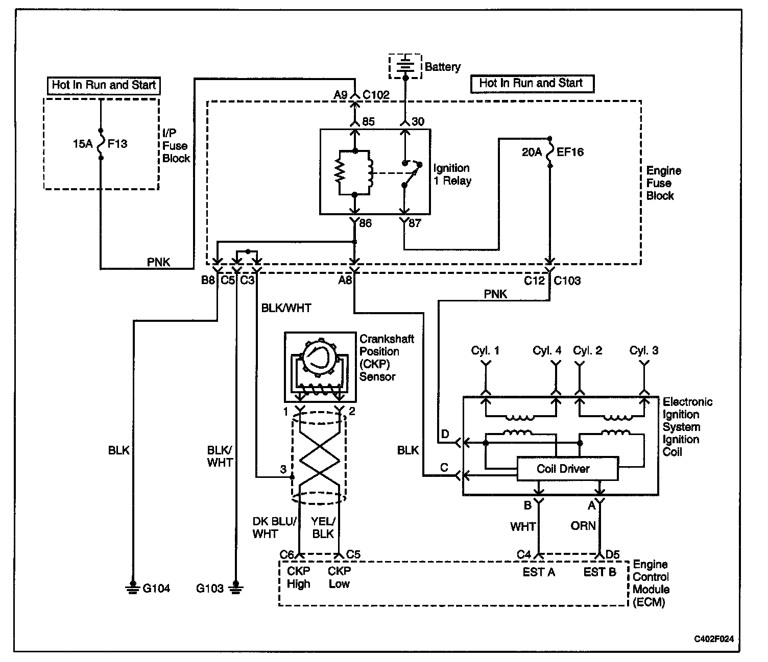 26. If the wiring between the EI system ignition coil and the ignition 1 relay connector terminal 87 is OK, the problem is in the ignition 1 relay circuit.