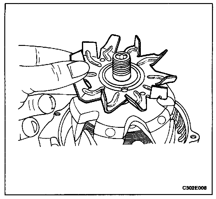 1. Check the bearing on the fan side of the rotor assembly. Replace the bearing if it is rough or worn, and especially if the generator was diagnosed as having a noisy bearing with the vehicle running.