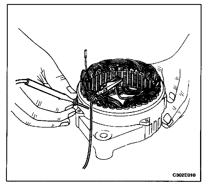 14. Using an ohmmeter, test the stator for ground. If the reading is low, replace the stator. Also, check the stator for an open circuit by placing the probes on two terminals. It the reading is high (infinite), replace the stator.