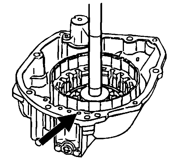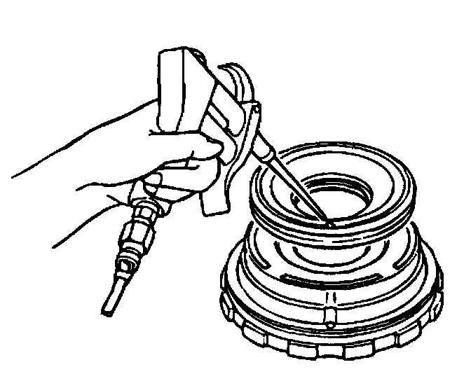 12. Install the input shaft into the rear case. Apply 57 psi (396 kPa) of compressed air into the oil passage shown to remove the forward clutch piston.