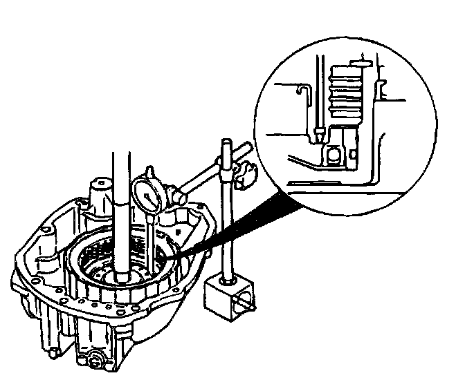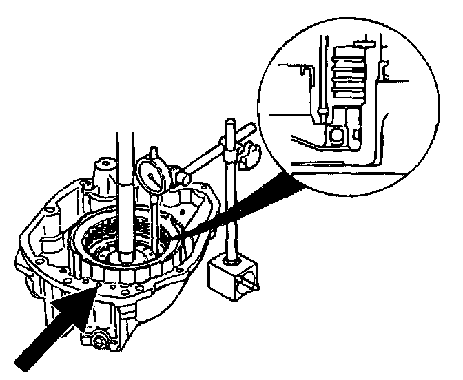 - Install the forward and direct clutch assembly into the rear cover. Install a dial indicator.