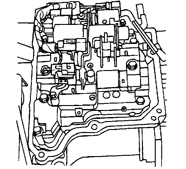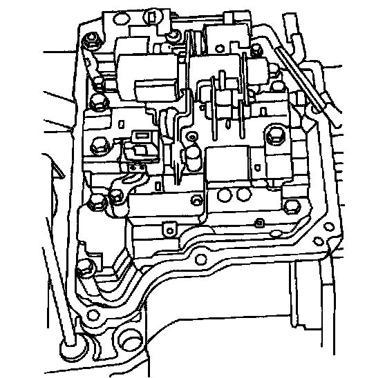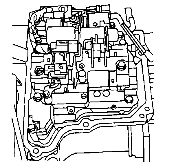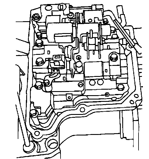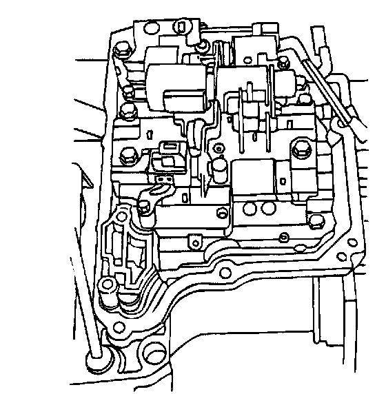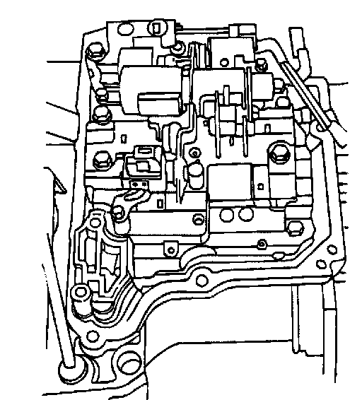 10. Loosen the seven valve body retaining bolts and remove six of the bolts. Support the valve body and remove the seventh bolt. Continue to support the valve body and carefully disconnect the manual valve connecting rod from the lever. Remove the valve body.