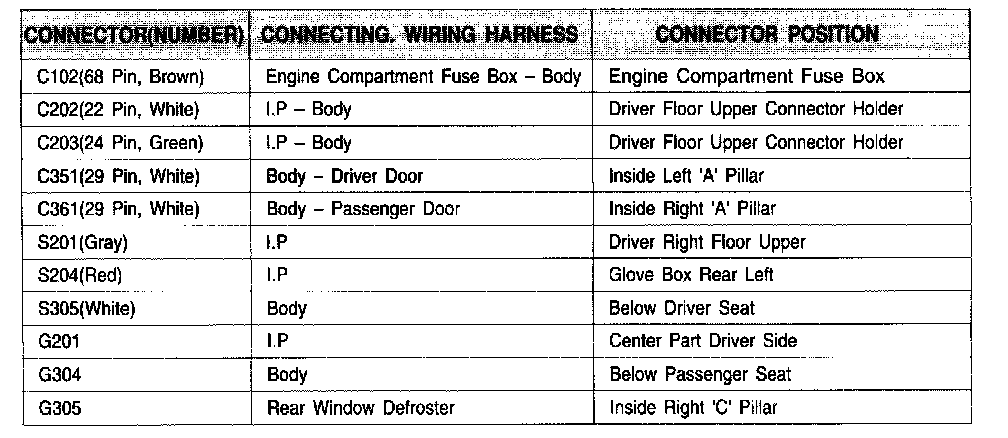 Connector Information Chart: