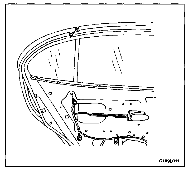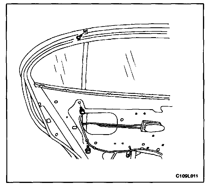 2. Remove the bolts and the screw from the rear door quarter window guide rail.