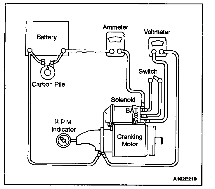 6. To begin the no-load test, close the switch and compare the rpm, the current, and the voltage readings with the specifications. Refer to "Starter Specifications" in this section. Make disconnections only with the switch open. Use the test results as follows: