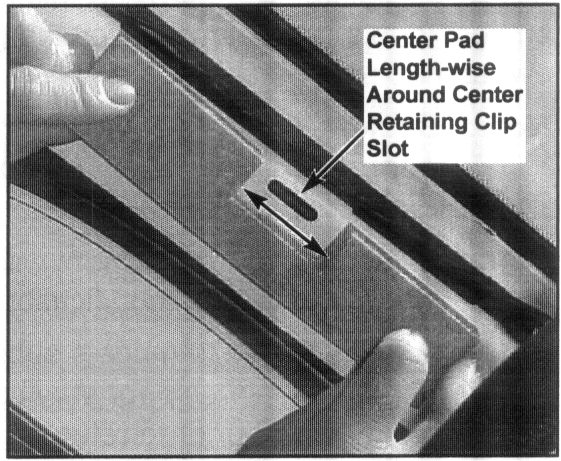 The bottom edge of the pad should be aligned with the body radius and the notch in the pad should be centered around the center retaining clip slot.