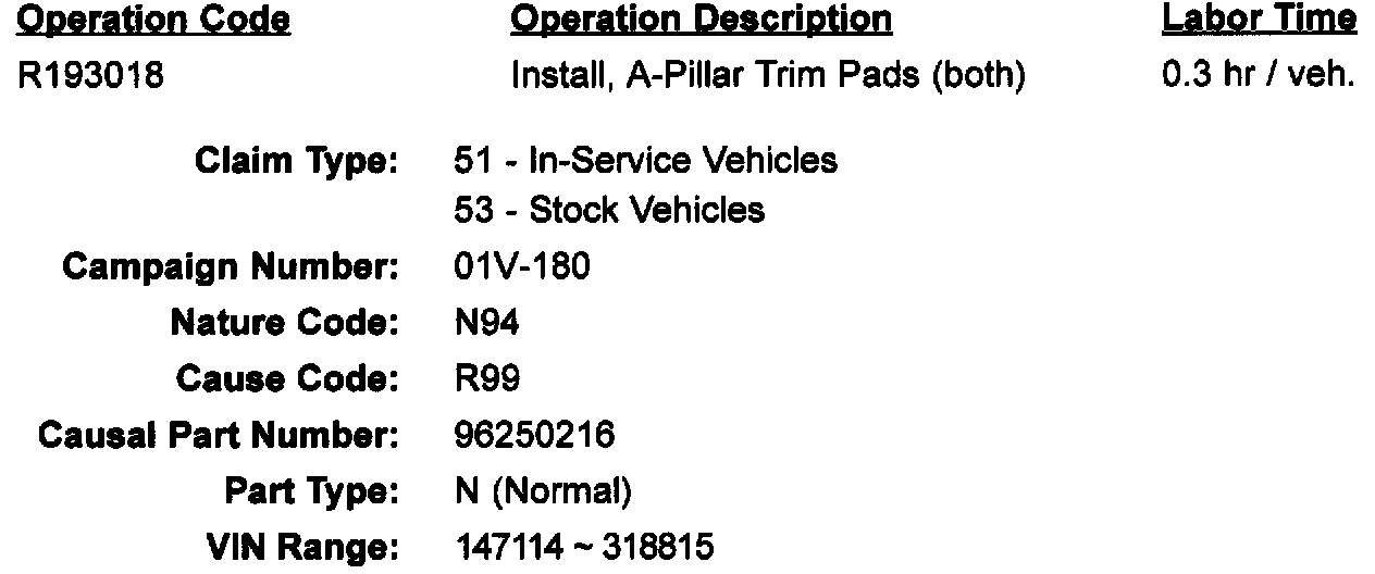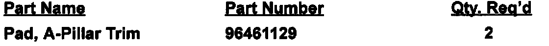 To meet the FMVSS 201 requirement, Daewoo is implementing a recall action where Daewoo Dealers are to remove both the Driver and Passenger A-Pillar Trim Panels and install an adhesive-backed pad material over the center portion of the A-Pillars before reinstalling the Trim Panels.