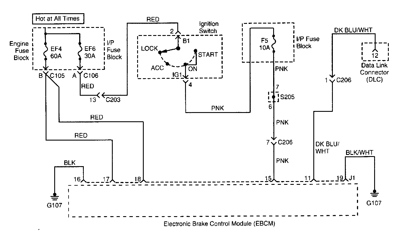 Battery voltage is supplied to the electronic brake control module (EBCM) through fuse F5 in the I/P fuse block, to terminal 15 of the EBCM connector. The voltage is present when the ignition switch is in the ON or START position.