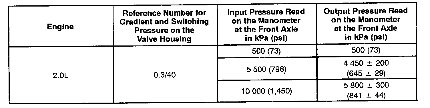 4. Build pressure until the test values in the following proportioning valve test chart are achieved.