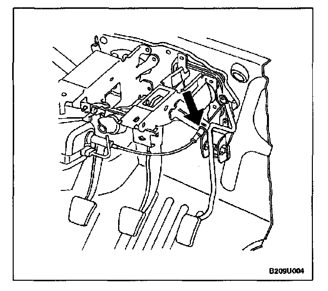 3. Press the retaining tabs of the cable adjuster, and remove the adjuster from the mounting bracket.
