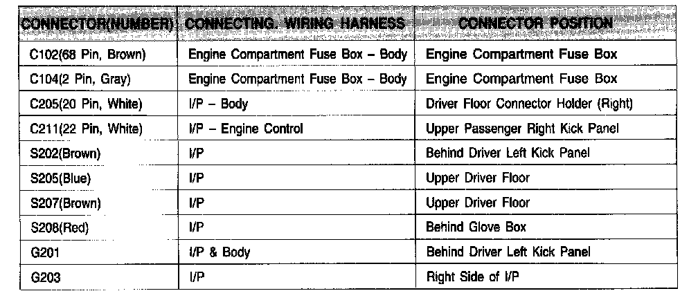 Connector Information Chart: