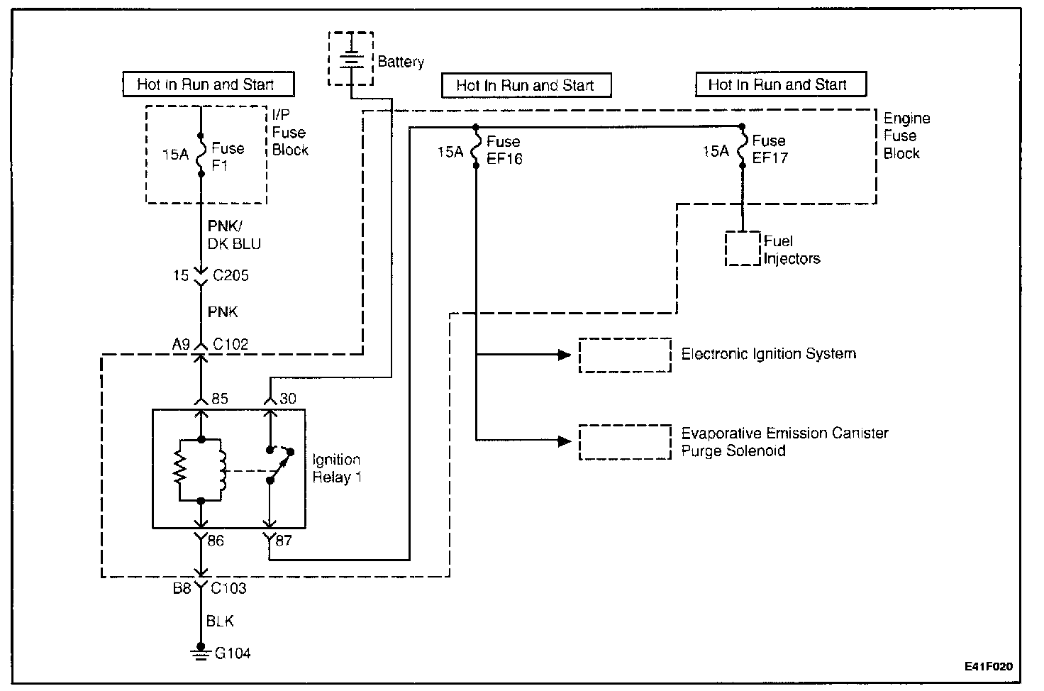 When the ignition is turned ON or to the START position, the ignition 1 relay is energized. The ignition 1 relay then supplies voltage to the engine fuse block fuse EF16 and the engine fuse block fuse EF17.The electronic ignition (EI) system ignition coil, the fuel pump relay (coil side), the variable geometry induction system (VGIS) solenoid, and the evaporative (EVAP) emission canister purge solenoid are supplied voltage through the engine fuse block fuse EF16. The fuel injectors are supplied voltage through the engine fuse block fuse EF17.