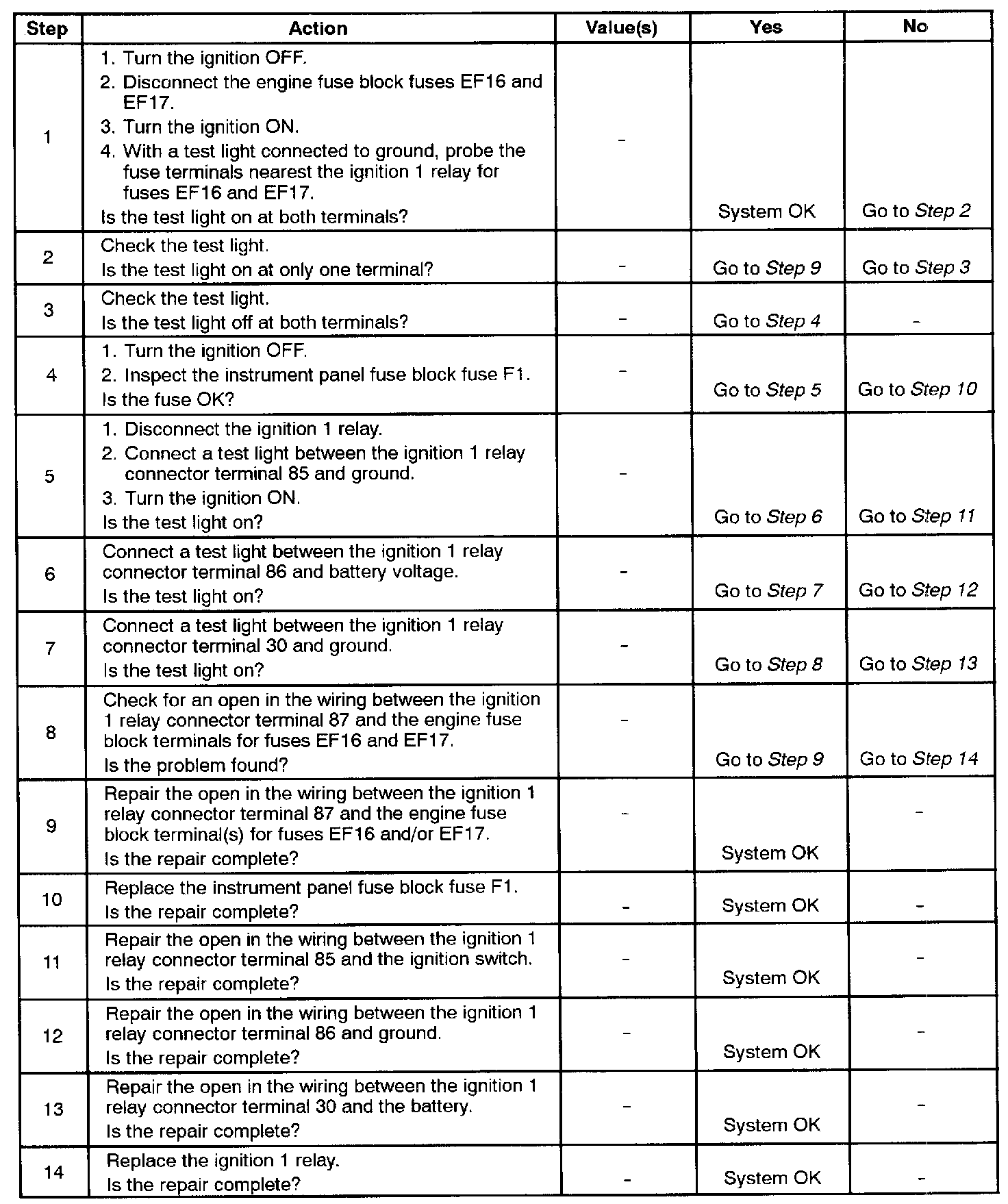 14. After confirming correct voltage and ground to the ignition 1 relay terminals, it can be determined that the ignition 1 relay is faulty.