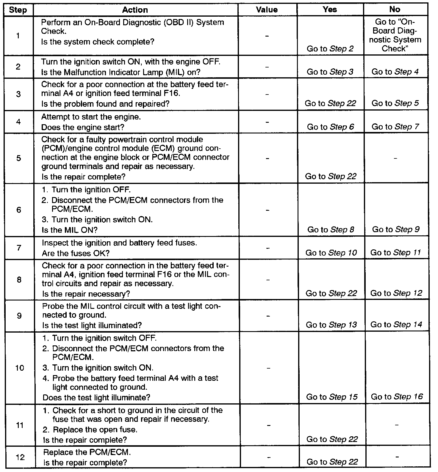 4. If the engine fails to start and the MIL is inoperative, then the fault can be isolated to either the PCM/ECM ignition feed, The battery feed, or a poor ground at the engine block, or the PCM/ECM.