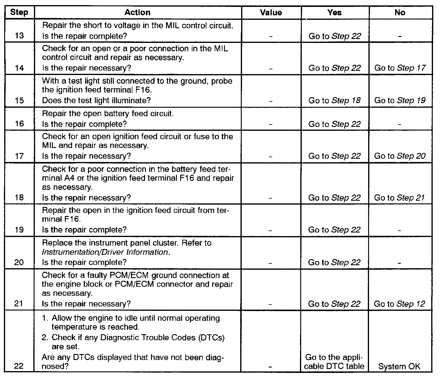 6. Probing the MIL circuit with a test light to ground stimulates the PCM/ECM's control of the MIL. If the MIL illuminates, then the malfunction can be isolated to the control of the MIL or a poor connection at the MIL terminal to the PCM/ECM. Connections that are suspected of being faulty should be thoroughly checked as described in the diagnostic aids.