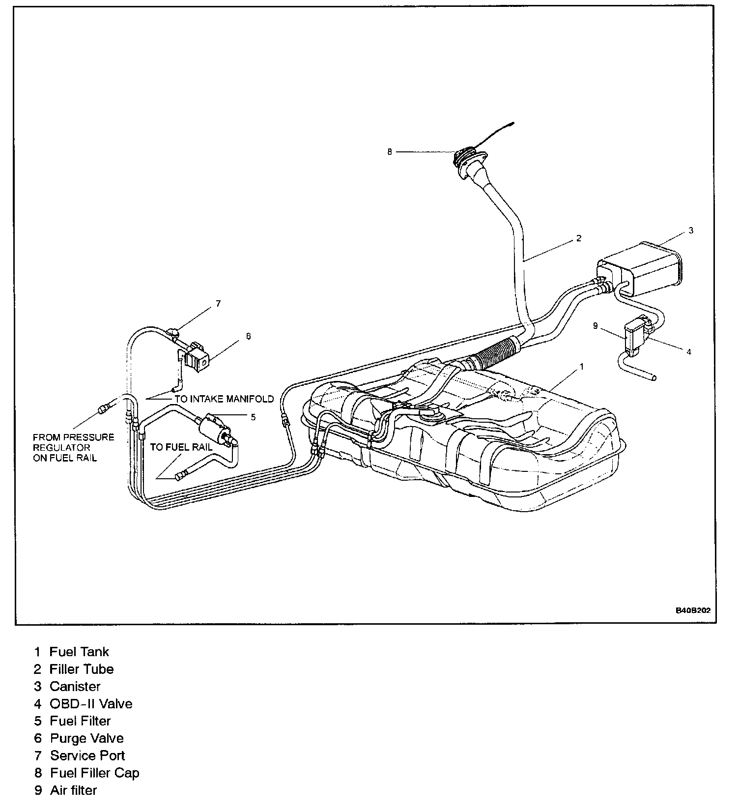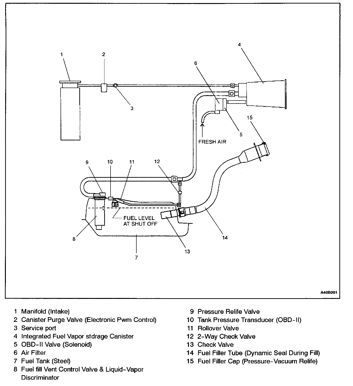 The NUBIRA 2.0 DOHC model is equipped with an On Board Diagnostic Stage II (OBD-II) system to meet enhanced emission control requirements. Within this OBD-II system, an On Board Refueling Vapor Recovery (ORVR) system has been developed and equipped to meet enhanced evaporative emission control requirements during vehicle moving, parking, and refueling at gas stations. The Daewoo ORVR system adopts one canister to collect both evaporative vapors during the moving & parking as well as refueling vapor. Collected vapor is consumed by the engine through the intake manifold during vehicle operation. The mechanism of Daewoo ORVR system to meet the ORVR requirement is to create suction inside filler neck by the aid of fuel flow through a reduced diameter section in the filler pipe. Therefore, Daewoo ORVR system adopts the so called "Liquid Trap" or "Liquid Seal" system that assures the long term durability.
