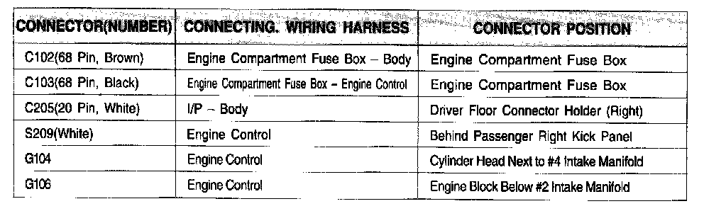 Connector Information Chart: