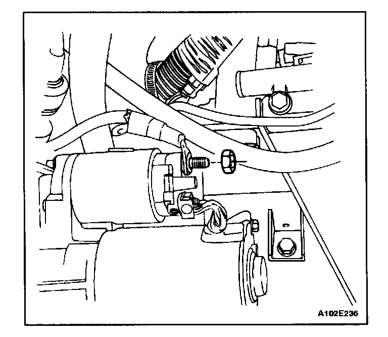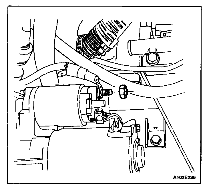 2. Remove the starter-to-engine block mounting bolt and the starter-to-transmission mounting bolt.