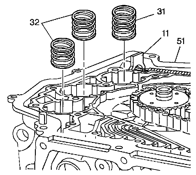 ACCUMULATOR SPRINGS INSTALLImportant: The 1-2 accumulator spring (31) is slightly taller than the other two springs (32). Install a 1-2 accumulator spring in the bore closest to the electrical pass-through connector (11).