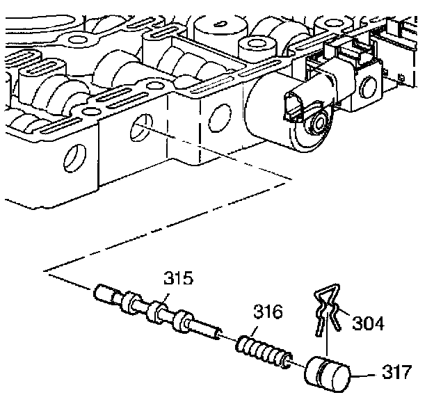 6. Remove the 1-2 shift solenoid retainer clip (304), the 1 -2 shift solenoid (305) with O-ring (303), the 1-2 shift valve (302), and the 1-2 shift valve spring (301).