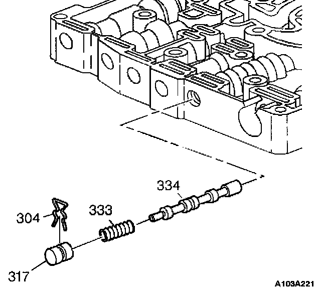 8. Remove the TCC control valve retainer clip (304), the bore plug (317), the spring (333), and the TCC control valve (334).