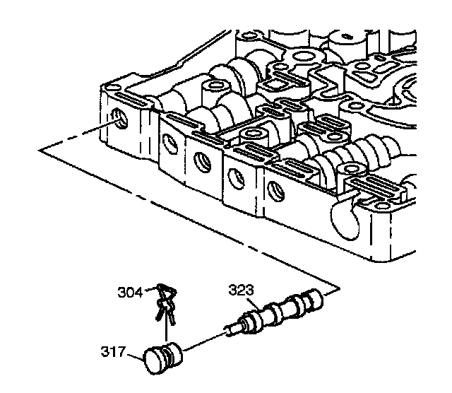 12. Remove the 1 -2/3-4 accumulator valve retainer clip (304), the plug (317), and the accumulator valve (323).