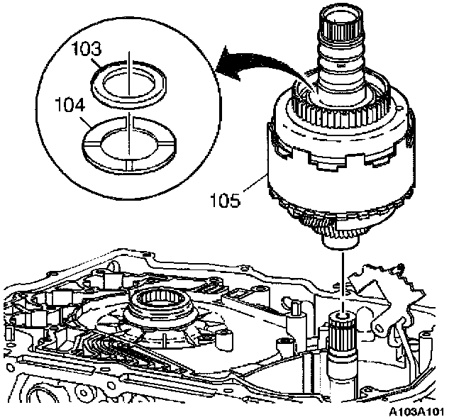 DIRECT/COAST CLUTCH AND REACTION GEAR SET REMOVALImportant: Keep the bearing assembly (103) and the selective thrust washer (104) on top of the direct/coast clutch and reaction carrier assembly (105).