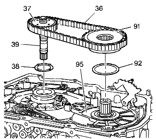2. If the drive sprocket to drive sprocket support thrust washer (38) has not remained with the drive sprocket assembly (37 and 39), remove the drive sprocket to drive sprocket support thrust washer (38). The driven sprocket to driven sprocket support thrust washer (92) should remain with the driven sprocket support assembly (95).