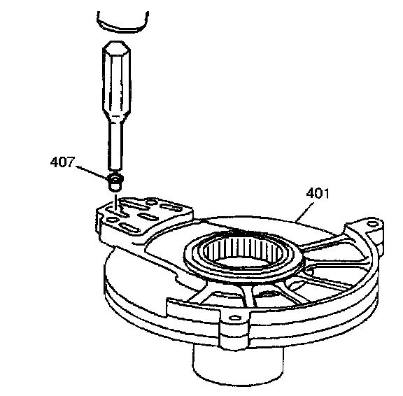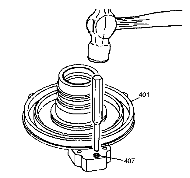 14. Using a 0.25 inch (6.25 mm) drift and a mallet, remove the valve assembly (407) from the driven sprocket support (401).