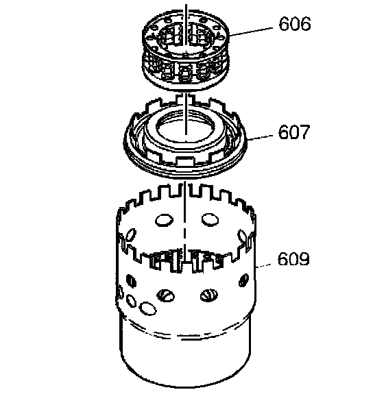 3. With the snap ring tabs facing up, assemble the forward clutch return spring assembly (606) into the forward clutch housing (609).