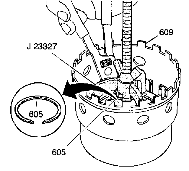 5. Assemble the snap ring (605) in order to retain the forward clutch return spring.