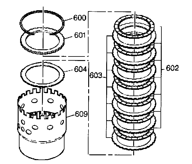 8. Install the seven steel plates (603) and the seven new fiber plates (602) in alternating order beginning with a steel plate (603).