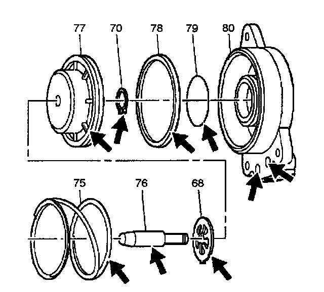 12. Install the snap ring (70) onto the servo pin (76) in order to retain the springs (68) and piston (77).