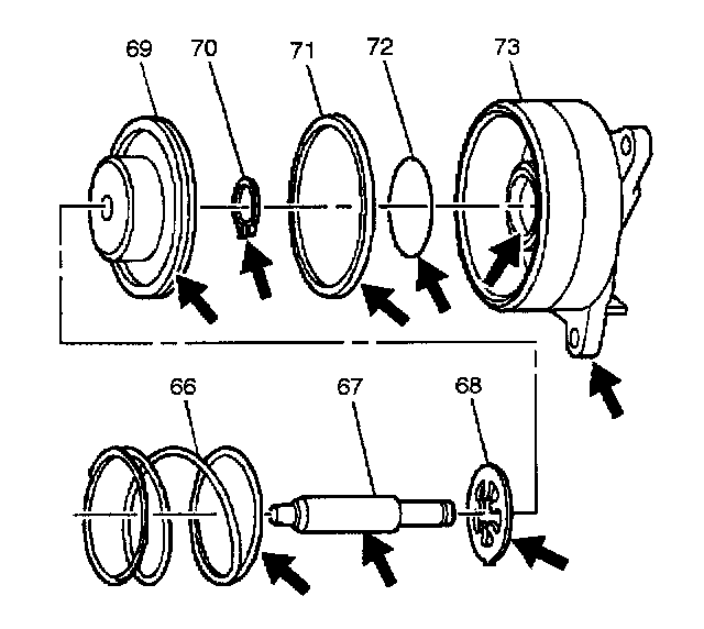 4. Assemble the servo piston assembly (67-70) into the servo cover (73). Lubricate the piston seals with transmission fluid in order to aid in assembly.