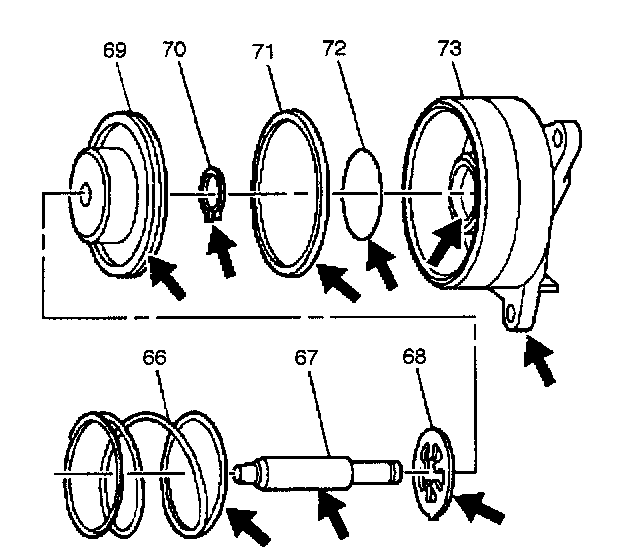 3. Remove the piston (69) and the servo cushion springs (68) from the servo pin (67).