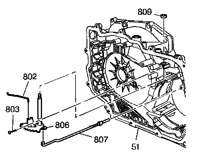 2. With the manual valve to detent lever link (802) and the parking lock actuator assembly (807) attached, install the manual shaft and detent lever assembly (806) into the case.