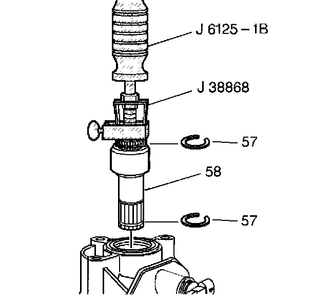 2. Attach the J 6125-1B to the J 38868. Install the J 38868 into the snap ring groove on the stub shaft (58). Tighten the J 38868 securely to the stub shaft.