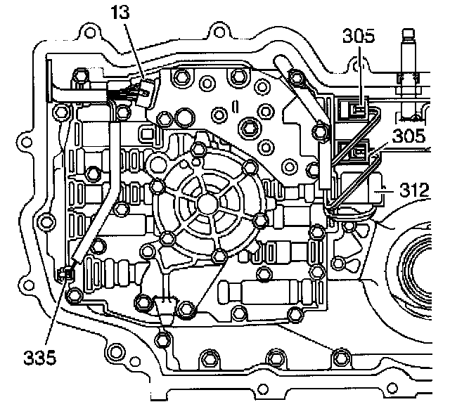 4. Disconnect the wiring harness connectors from the TCC solenoid (335).
