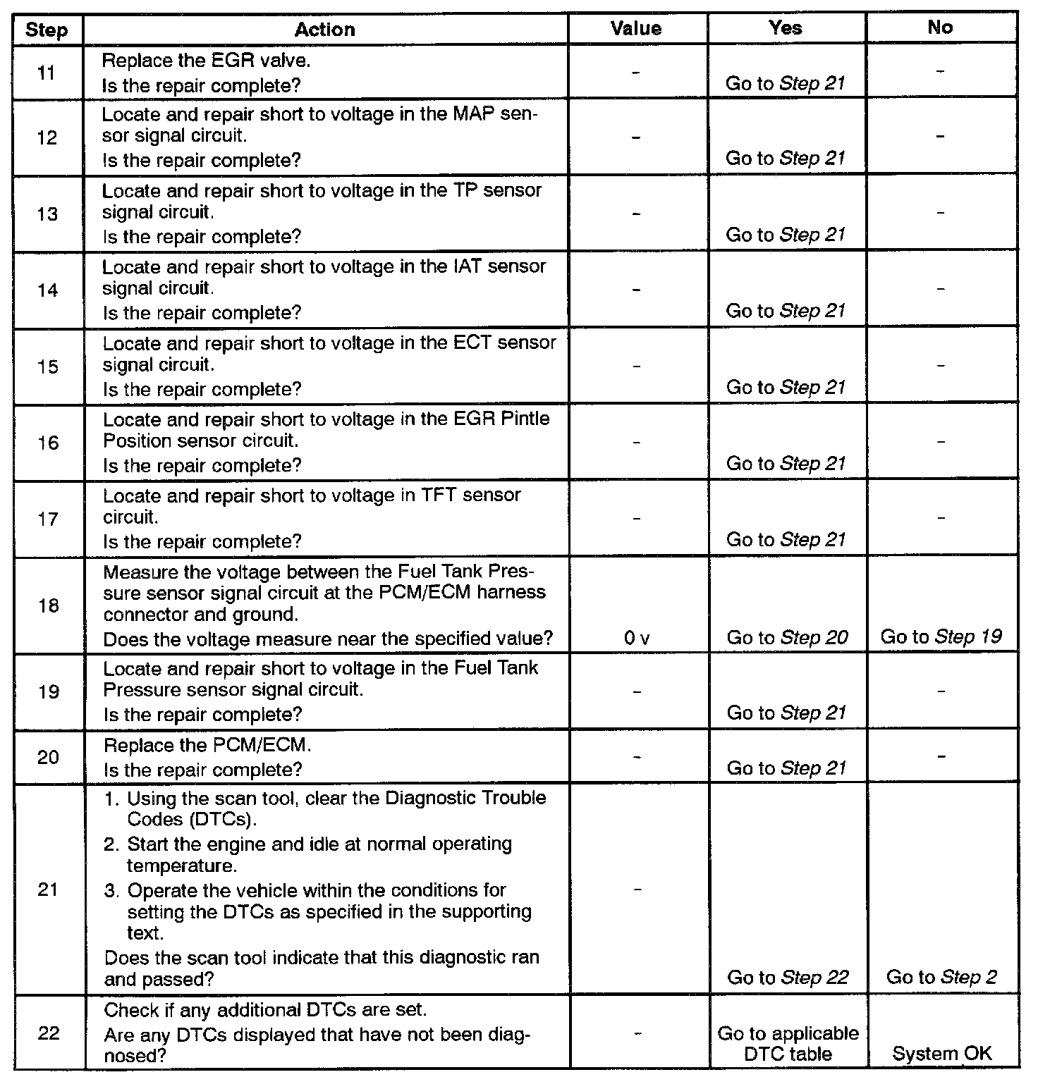 11-19. If a sensor input circuit has been shorted to voltage, ensure that the sensor has not been damaged. A damaged IAT or ECT sensor will continue to indicate a high voltage or low temperature after the affected circuit has been repaired. A damaged ACT, TP, MAP, Fuel Tank Pressure, or EGR Pintle Position sensor will indicate a high or low voltage or may be stuck at a fixed value after the affected circuit has been repaired. If the sensor has been damaged, replace it.